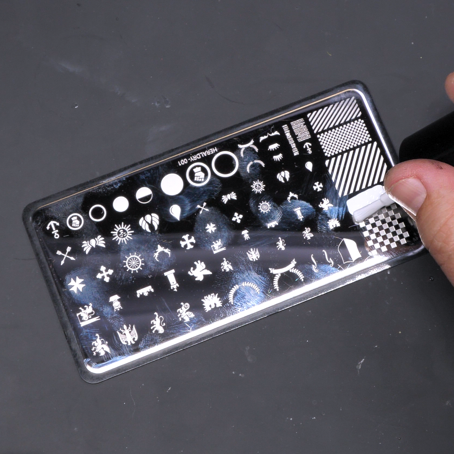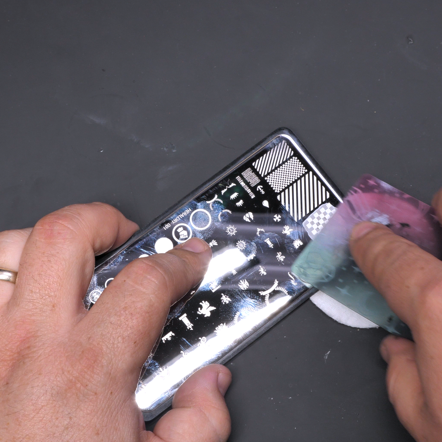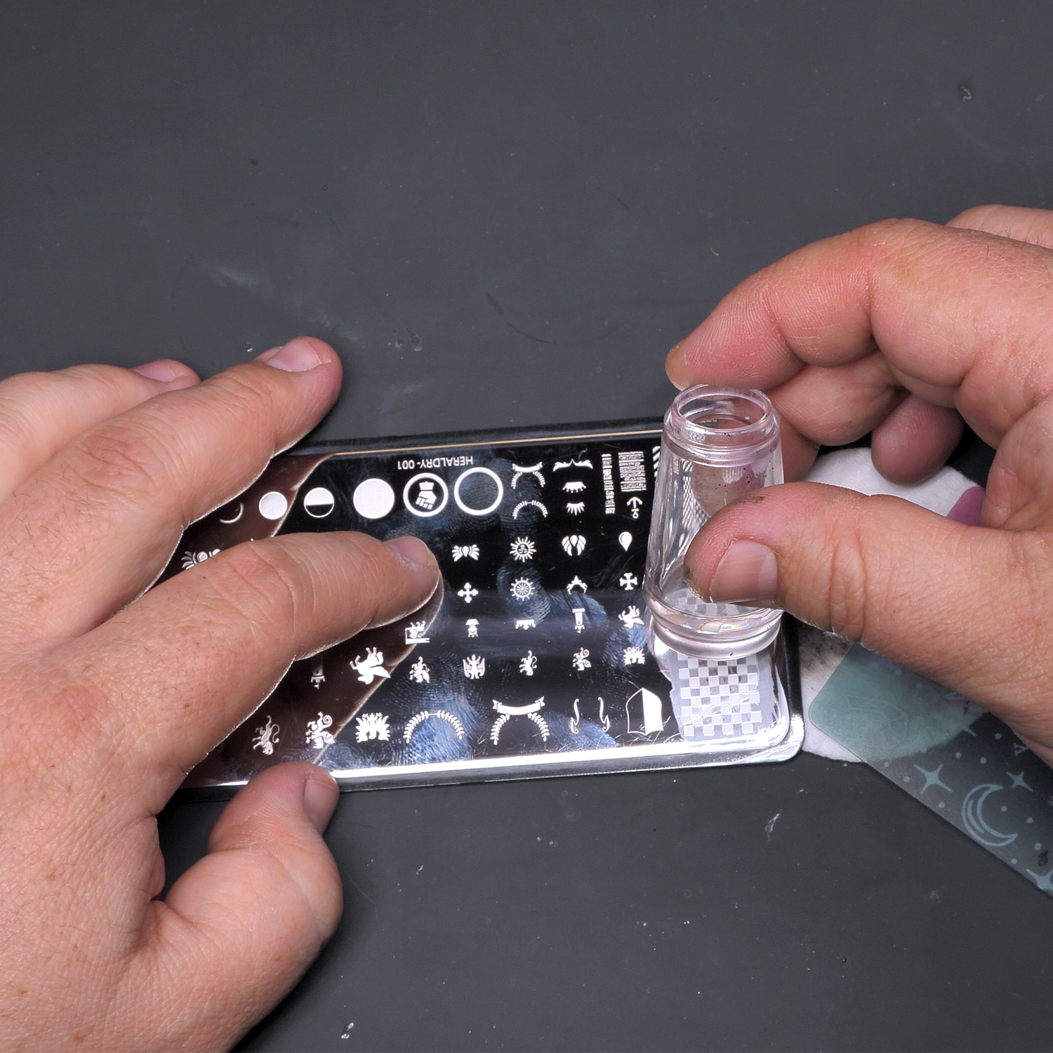 If you pick up unwanted parts of other designs, use the scraper card or a piece of tape to clean them off the stamper head. Once you have a clean transfer, work quickly—the color dries fast! Place your design before it sets.